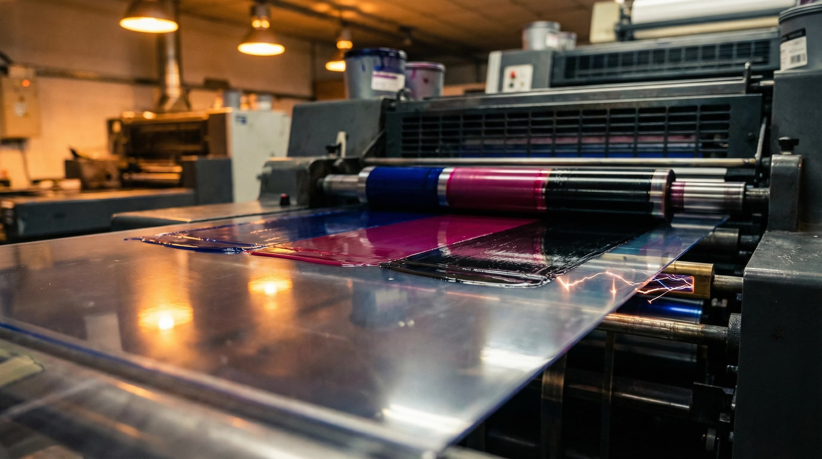 The problem is compounded on rigid PVC for offset printing because PVC is an excellent insulator — static charges accumulate and dissipate slowly, especially in low-humidity pressroom environments.
